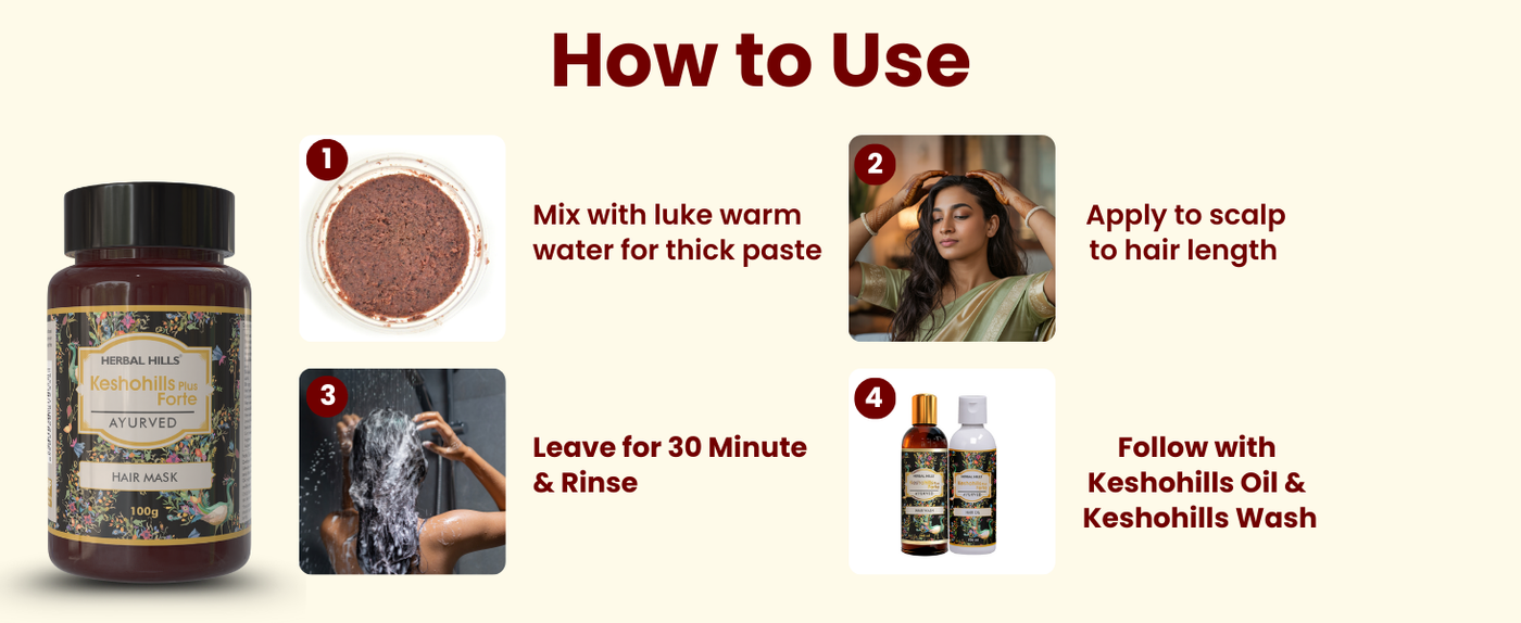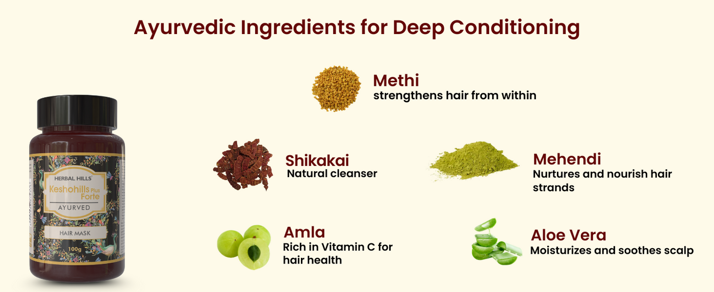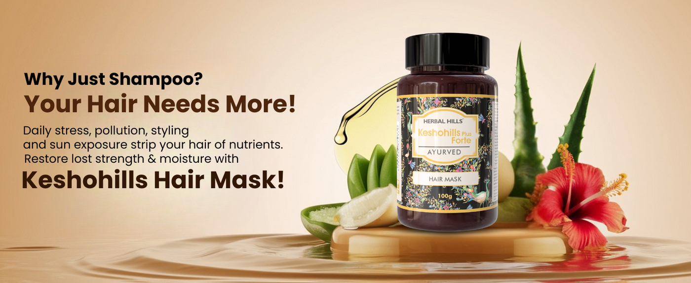 Keshohills Forte Hair Mask is a 100% natural Ayurvedic powder blend crafted to condition, nourish, and rejuvenate your hair with the power of farm-fresh herbs.