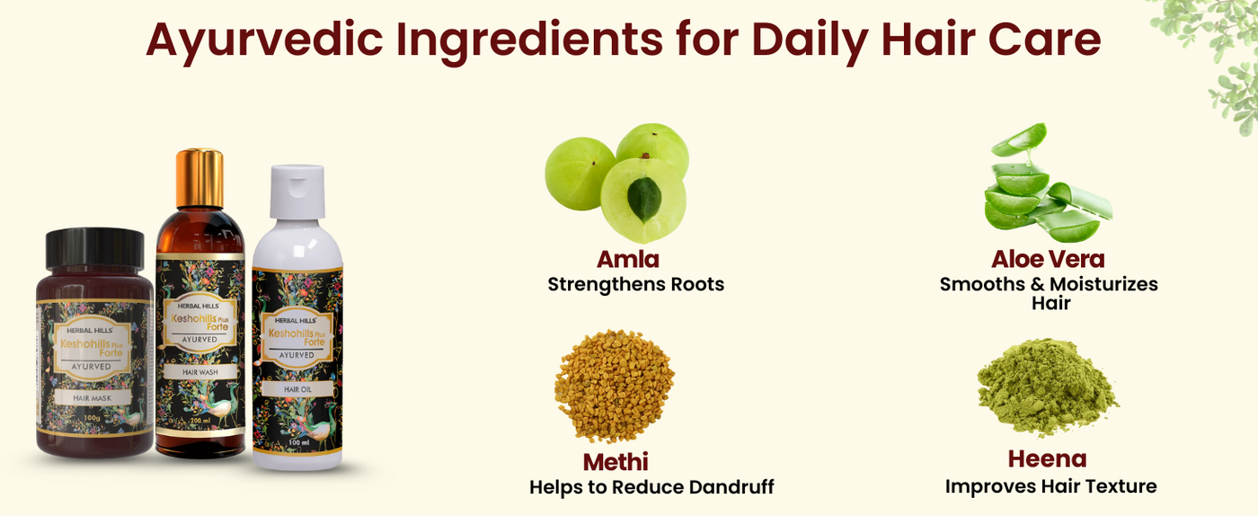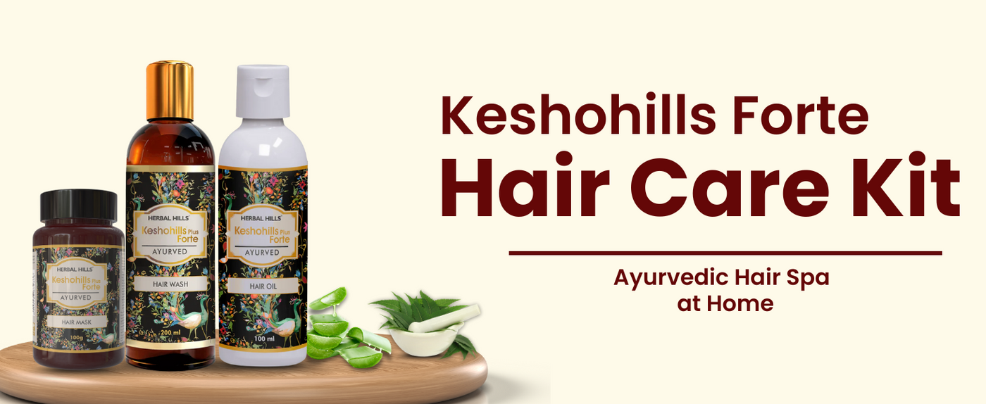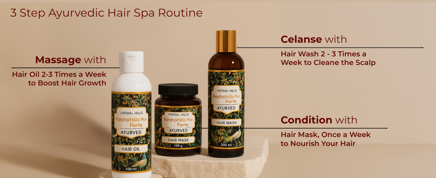 A complete Ayurvedic solution for stronger, healthier hair with Keshohills Hair Oil, Hair wash, and hair mask. Nourishes the scalp, strengthens roots, and promotes hair growth using expert-formulated natural ingredients. Long-term care for vibrant hair!