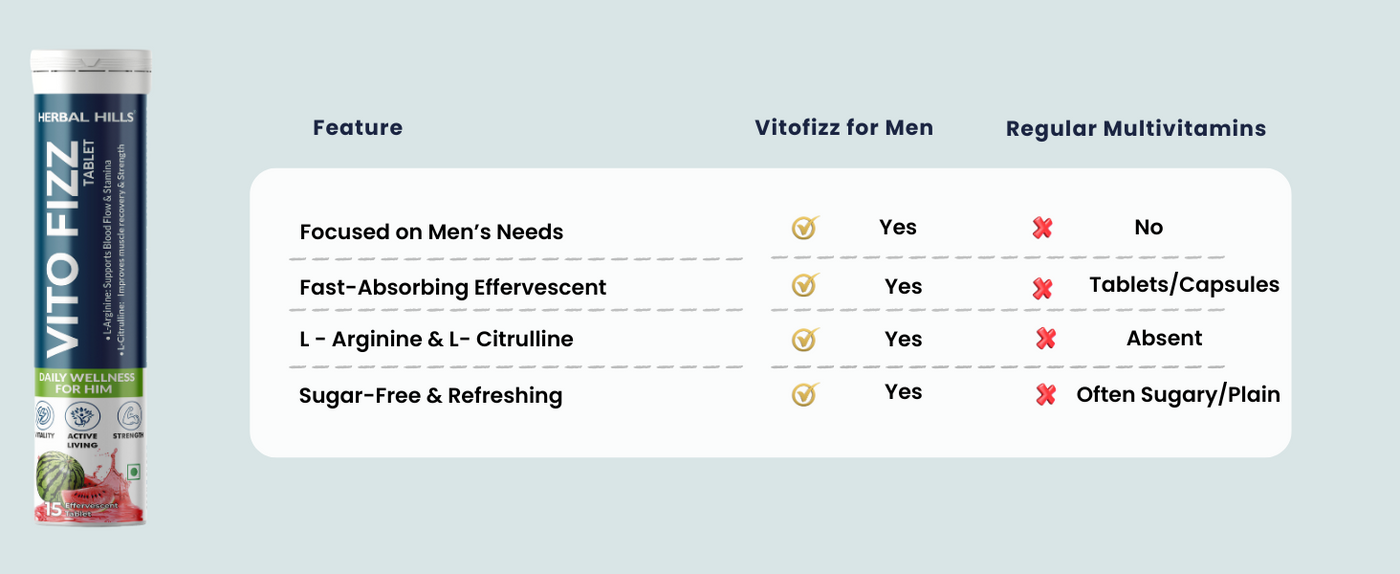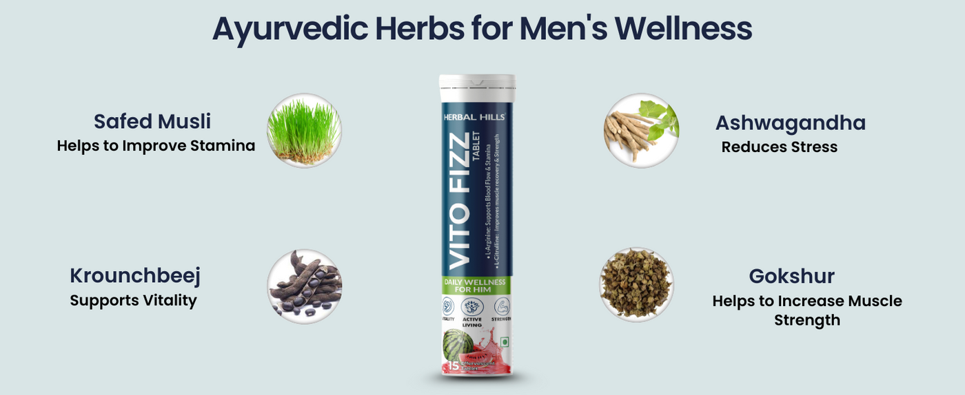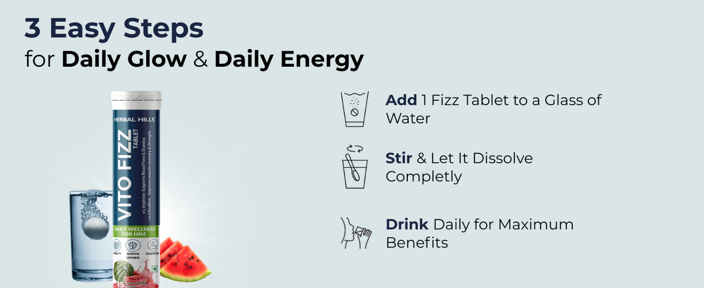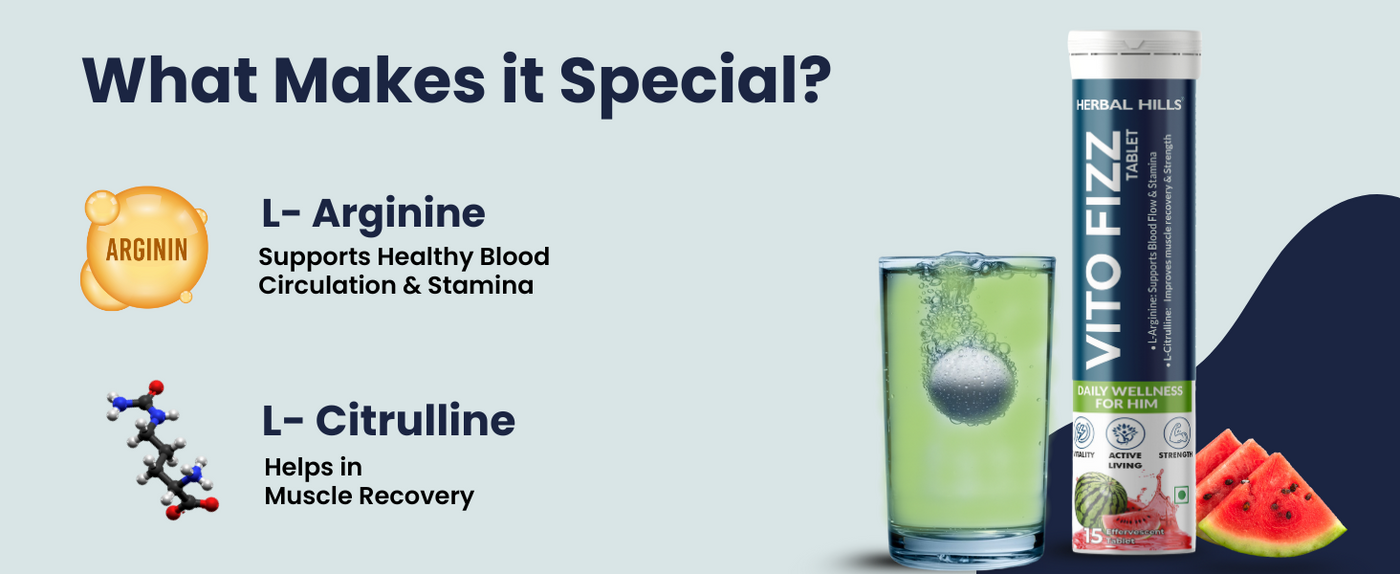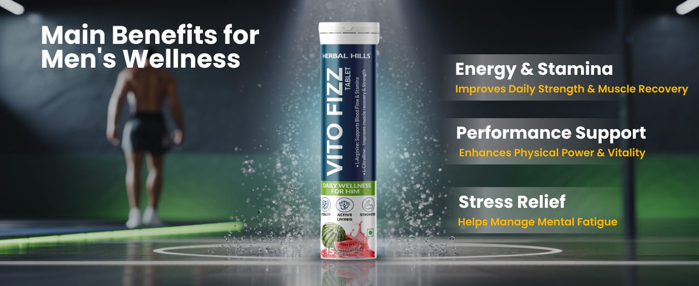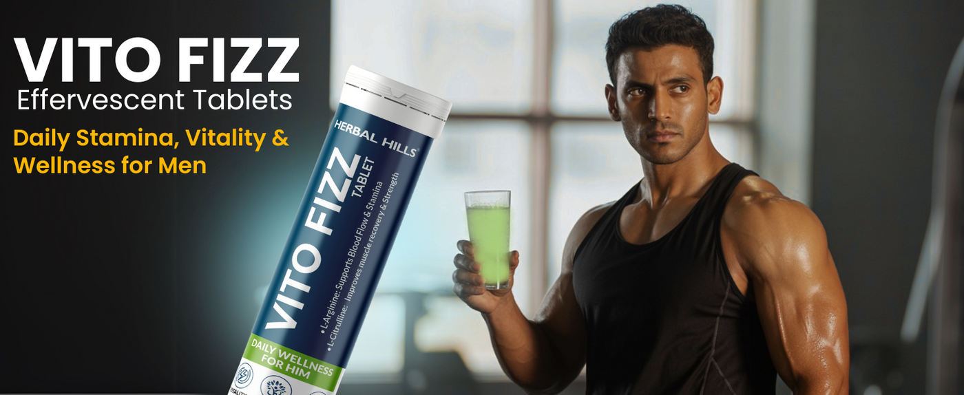 Buy Herbal Hills VitoFizz Effervescent Tablets, refreshing L-arginine tablets for men’s daily wellness, hydration, and stamina-focused routines.