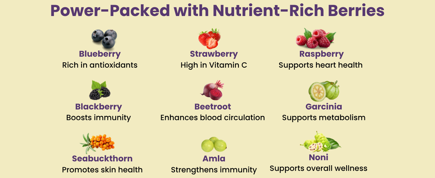 Vitamin C Boost: The mix of berries contributes to a natural boost in vitamin C, crucial for immune support, skin health, and overall vitality.