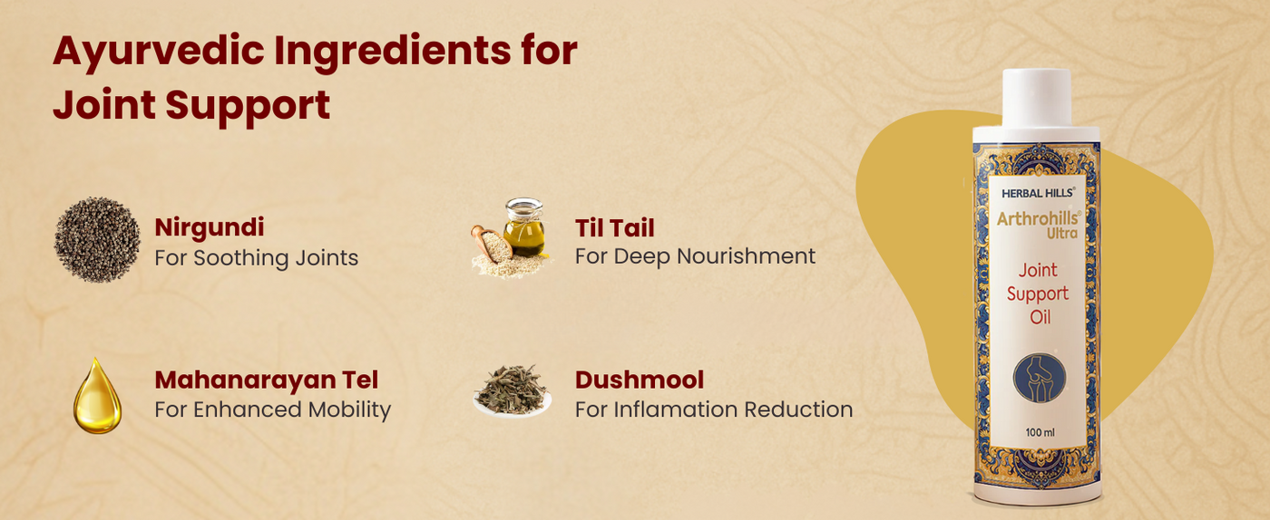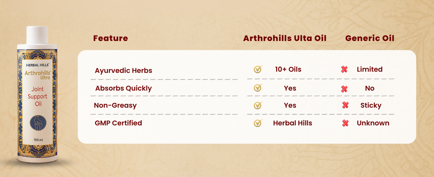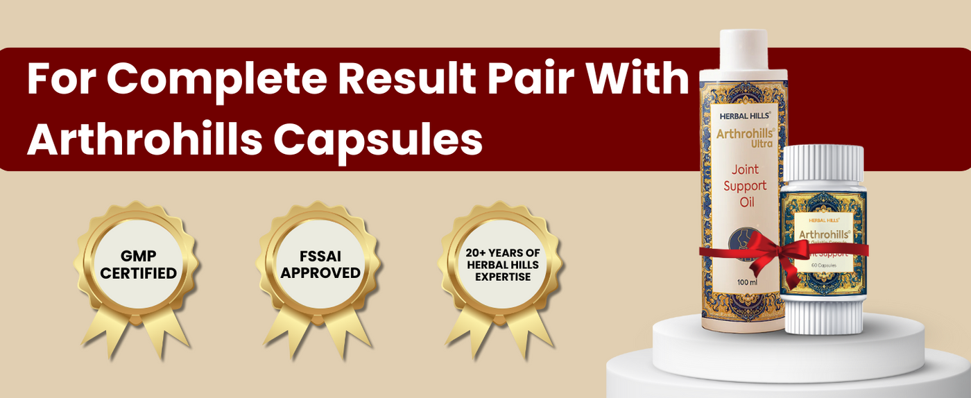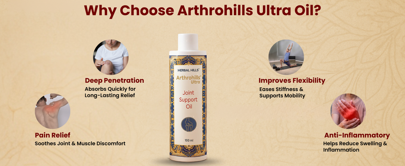 ARTHROHILL ULTRA OIL is a pure, natural Ayurvedic oil crafted with a blend of traditional herbs to provide anti-inflammatory, anti-arthritic, and joint mobility support. It relieves muscle stiffness, improves flexibility, and promotes overall joint health, offering a chemical-free solution for an active lifestyle.